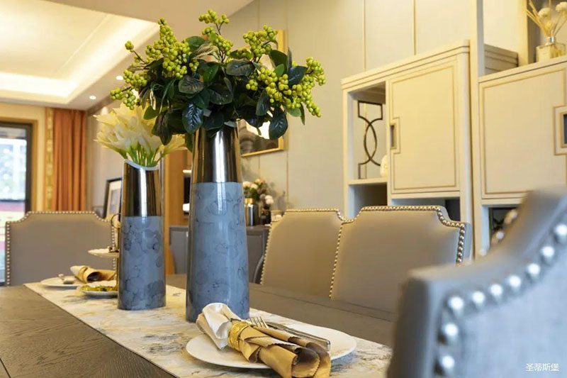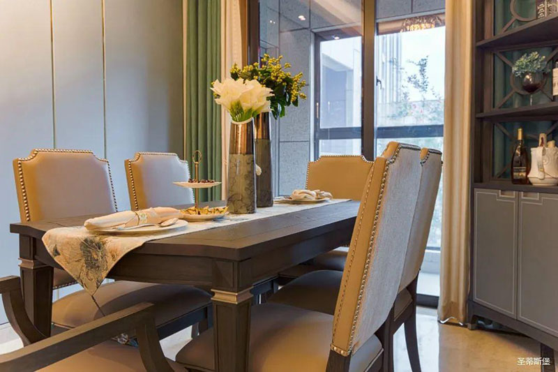 看似传统实木的餐桌,细节之处却尽显轻奢精致格调,高级灰软包,原金属铆钉嵌入,在体现时尚感的同时,也提升了用餐的舒适度。