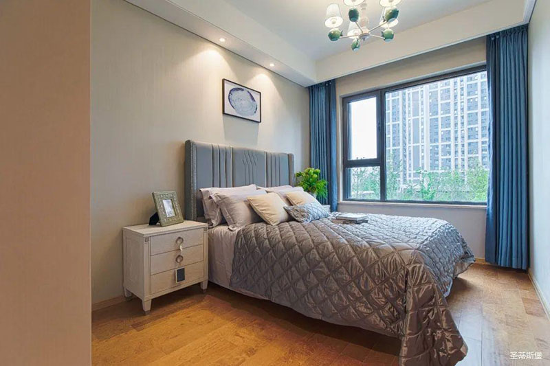 次卧高床屏由金属镶嵌,呈现简约有序的线条,雾霾蓝床屏与浅蓝朦胧装饰画,窗帘相呼应,色泽搭配和谐自然,无不透漏着一种简洁大方视觉体验。